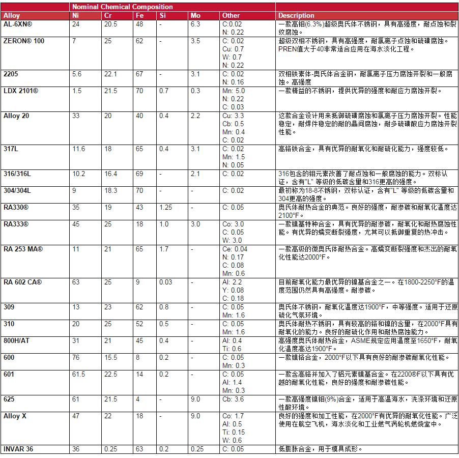 | 環(huán)境控制 | 我們提供的許多合金可以運(yùn)用于污染控制系統(tǒng),諸如煙氣脫硫單元FGD,濕法靜電除塵WESP和碳吸收器。在高氯標(biāo)準(zhǔn),酸性PH值和上升溫度組成的腐蝕環(huán)境中,擁有鉬元素的合金可以有效抵御點(diǎn)蝕和裂紋腐蝕。. AL-6XN, ZERON 100和2205在許多FGD和WESP領(lǐng)域中,用來制造吸收容器, 墻壁,輸氣管道,導(dǎo)向裝置,泵,紙漿處理系統(tǒng),葉輪和節(jié)氣閥。AL-6XN在很多FGD系統(tǒng)領(lǐng)域服務(wù)了20多年沒有任何質(zhì)量問題。雙相鋼2205和ZERON 100的高強(qiáng)度和相對高鎳合金更經(jīng)濟(jì)的成本,使得它們的運(yùn)用變得越來越廣。2205雙相鋼也可以用作飛機(jī)制造廠的碳吸收和封存容器 |