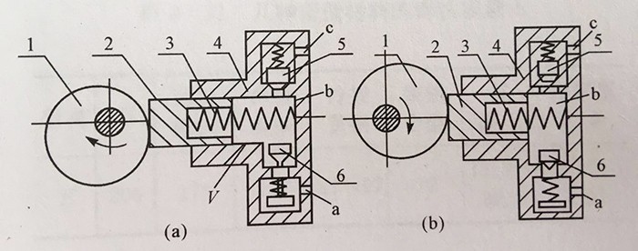 (2)有配流裝置。它保證密封容積由小變大時只與吸油管接通;密封容積由大變小時只與壓油管相通。上述單柱塞泵中的兩個單向閥5和6就是起配流作用的,是配流裝置的一種。