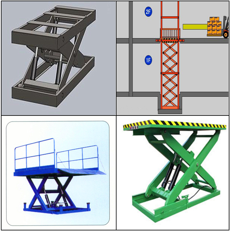 | 平臺(tái)部分 | 有封閉式(即轎廂式)或敞開式,兩側(cè)裝有導(dǎo)向輪或?qū)а?,平臺(tái)底部連接升降油缸或連接升降剪叉型鋼架 |