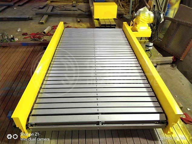 鏈板輸送線升降機(jī)的基本工作原理是利用鏈條帶動鏈板進(jìn)行循環(huán)運(yùn)動,從而實(shí)現(xiàn)物料的垂直升降。物料放置在鏈板上,當(dāng)鏈條受到電機(jī)的驅(qū)動而運(yùn)動時(shí),鏈板會沿著預(yù)先設(shè)計(jì)的軌道上升或下降,將物料從一個(gè)高度運(yùn)送到另一個(gè)高度。
